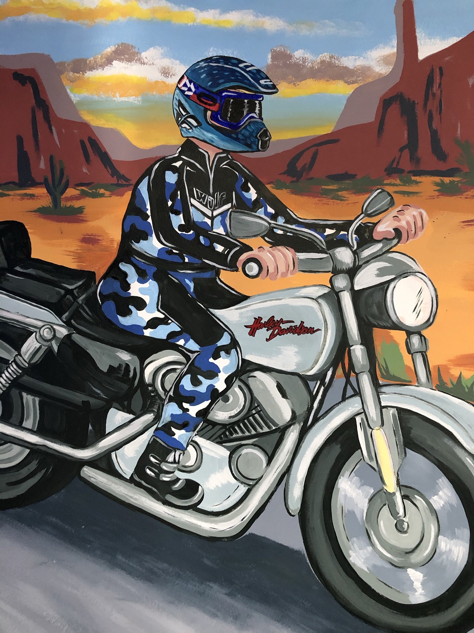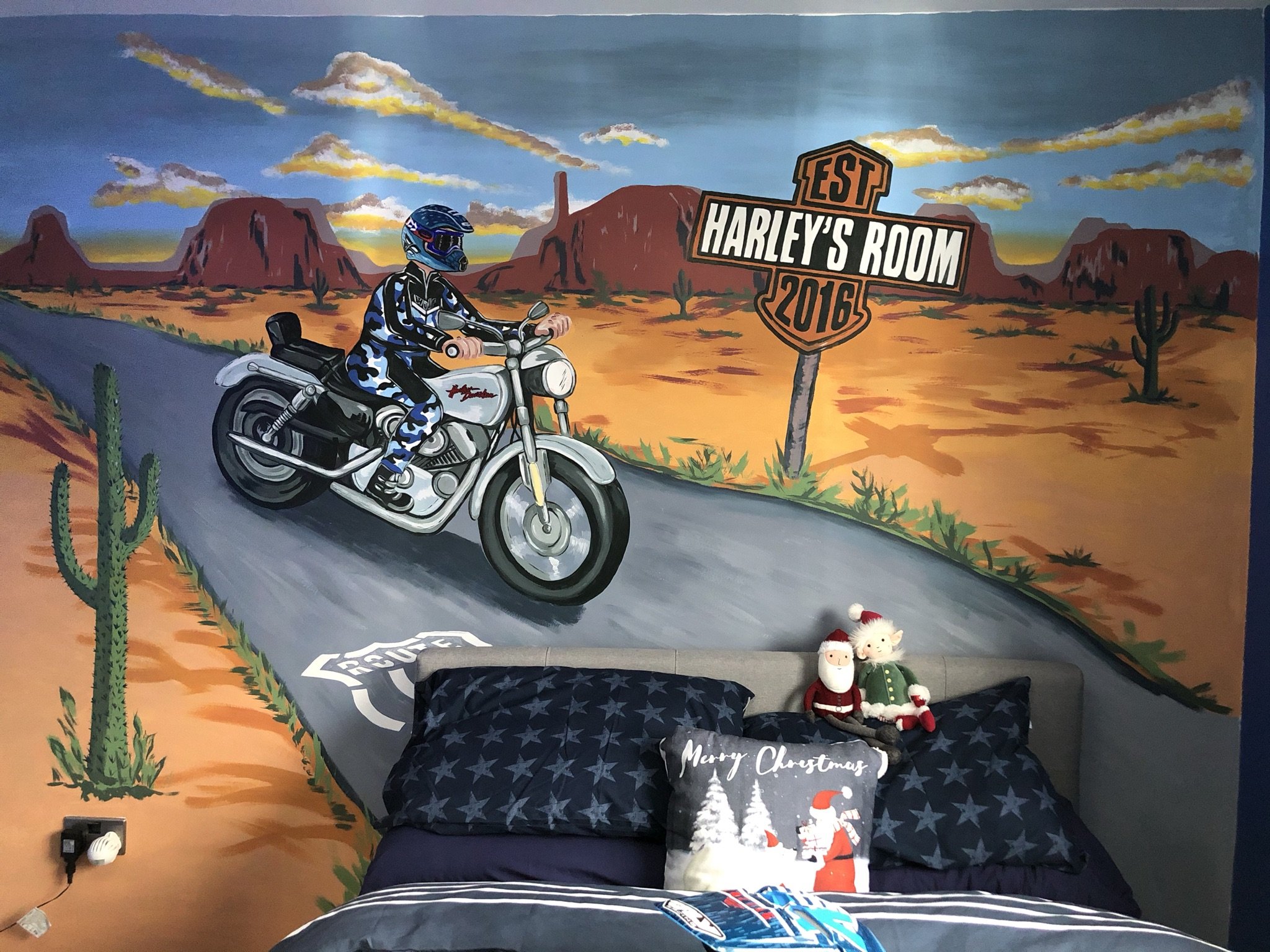 Route 66 ‘Harley’ BedroomA tribute to Harley’s grandad, this Route 66 inspired wall mural was designed with children in mind, taking on an illustrative style. Full wall coverage in bright, earthy tones brings a real focal point to the room.